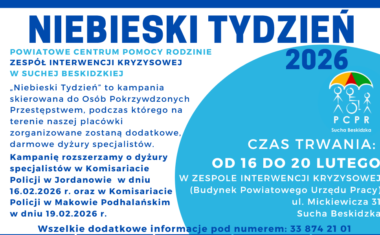 Powiatowe Centrum Pomocy Rodzinie – Zespół Interwencji Kryzysowej w Suchej Beskidzkiej serdecznie zaprasza do udziału w kampanii „Niebieski Tydzień”.