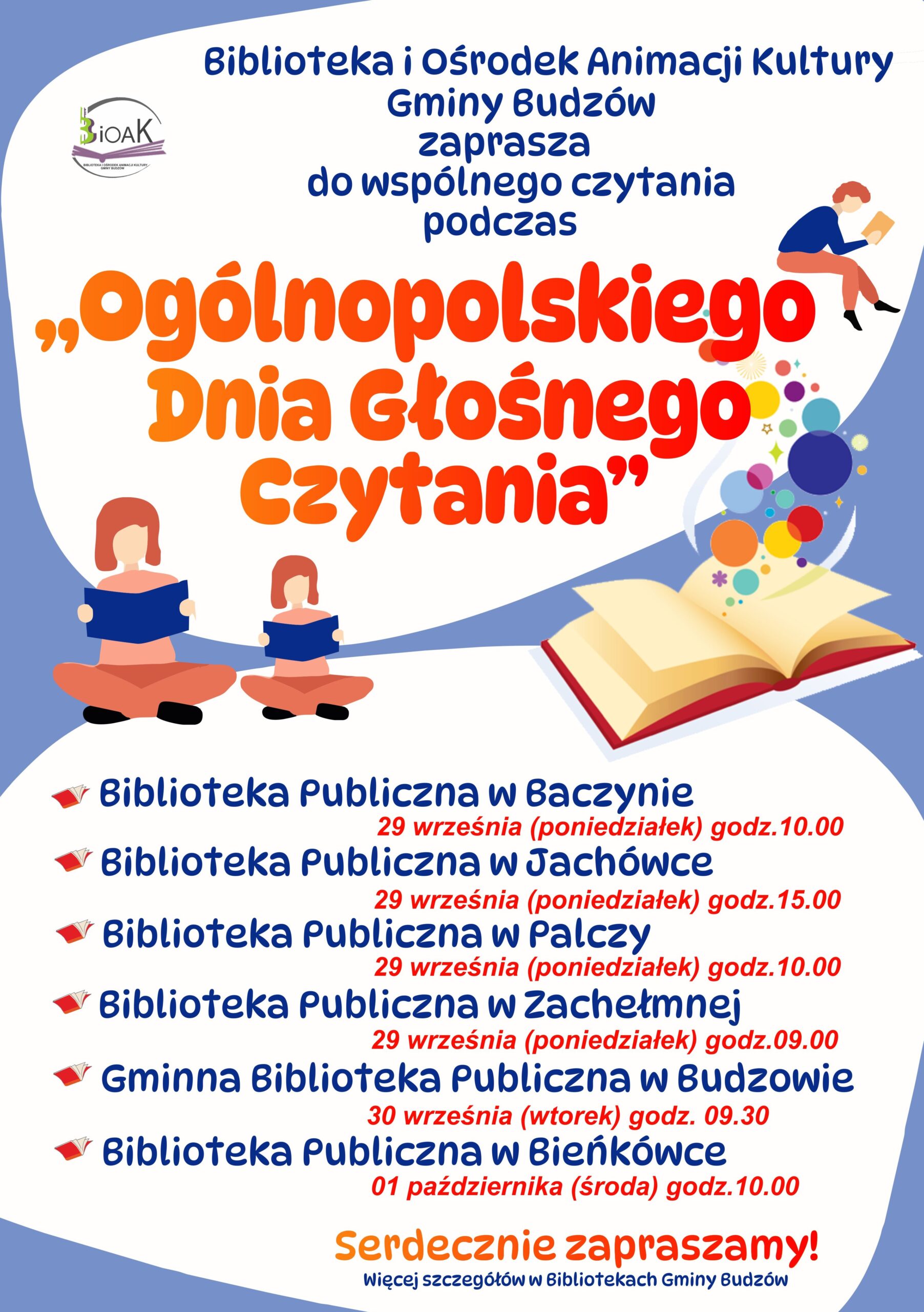 Biblioteka i Ośrodek Animacji Kultury Gminy Budzów zaprasza do wspólnego czytania podczas „Ogólnopolskiego Dnia Głośnego Czytania”. Biblioteka Publiczna w Baczynie 29 września (poniedziałek) godz. 10.00. Biblioteka Publiczna w Jachówce 29 września ( poniedziałek) godz. 15.00. Biblioteka Publiczna w Palczy 29 września (poniedziałek) godz. 10.00. Biblioteka Publiczna w Zachełmnej 29 września (poniedziałek) godz. 9.00. Gminna Biblioteka Publiczna w Budzowie 30 września (wtorek) godz. 9.30. Biblioteka Publiczna w Bieńkówce 01 października (środa) godz. 10.00. Serdecznie zapraszamy! Więcej szczegółów w Bibliotekach Gminy Budzów.